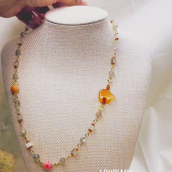 Discover captivating color and shimmer with this hand-linked necklace showcasing labradorite's iridescent flash, fire agate's warm glow, and carnelian's rich amber tones. Each bead is carefully connected using tarnish-resistant wire for lasting durability and refined finish. The dependable lobster clasp provides secure closure, while the 19.5-inch length drapes gracefully for versatile styling. A dynamic piece that celebrates the natural beauty and energetic character of three complementary gemstones.